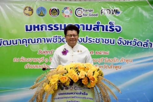 การจัดมหกรรมความสำเร็จการพัฒนาคุณภาพชีวิตของประชาชนจังหวัดลำพูนในวันนี้ เพื่อเป็นการเผยแพร่ผลสำเร็จของการพัฒนาคุณภาพชีวิตของประชาชน และเสริมสร้างชุมชนเข้มแข็ง เศรษฐกิจฐานรากมั่นคง อีกทางเพื่อเป็นการส่งเสริมความรู้ความเข้าใจ แนวทางการขับเคลื่อนการพัฒนาคุณภาพชีวิตของประชาชน และเสริมสร้างชุมชนเข้มแข็ง เศรษฐกิจฐานรากมั่นคง ตลอดจนเพื่อกระตุ้นความสนใจและเสริมสร้างแรงบันดาลใจในการร่วมมือของทุกภาคส่วน ในการพัฒนาคุณภาพชีวิตของประชาชนและเสริมสร้างชุมชนเข้มแข็งเศรษฐกิจฐานรากมั่นคงในระดับพื้นที่